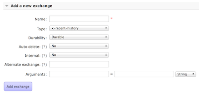 Once we start the broker we can see in the management interface that we can now add exchanges of the type x-recent-history.